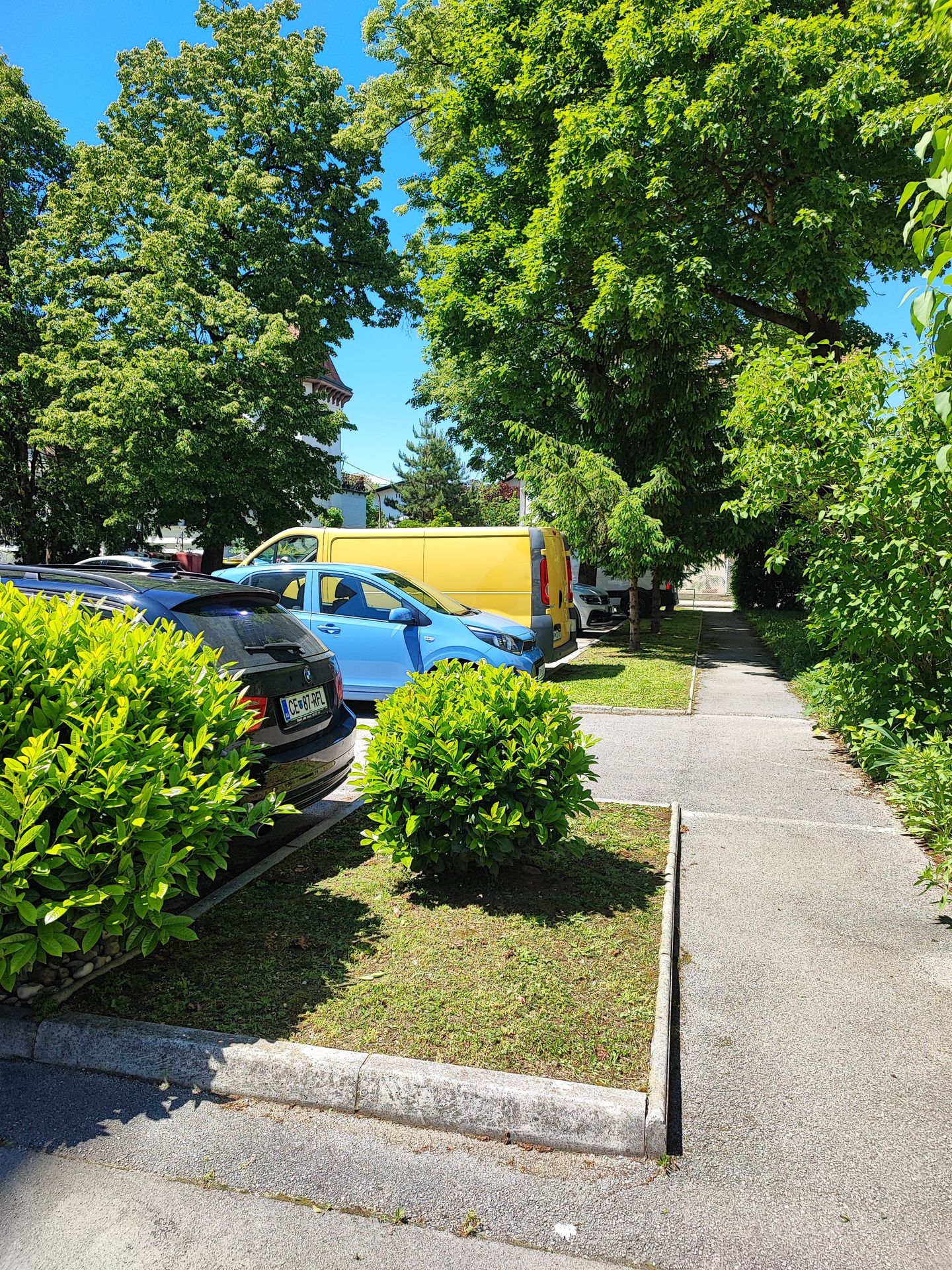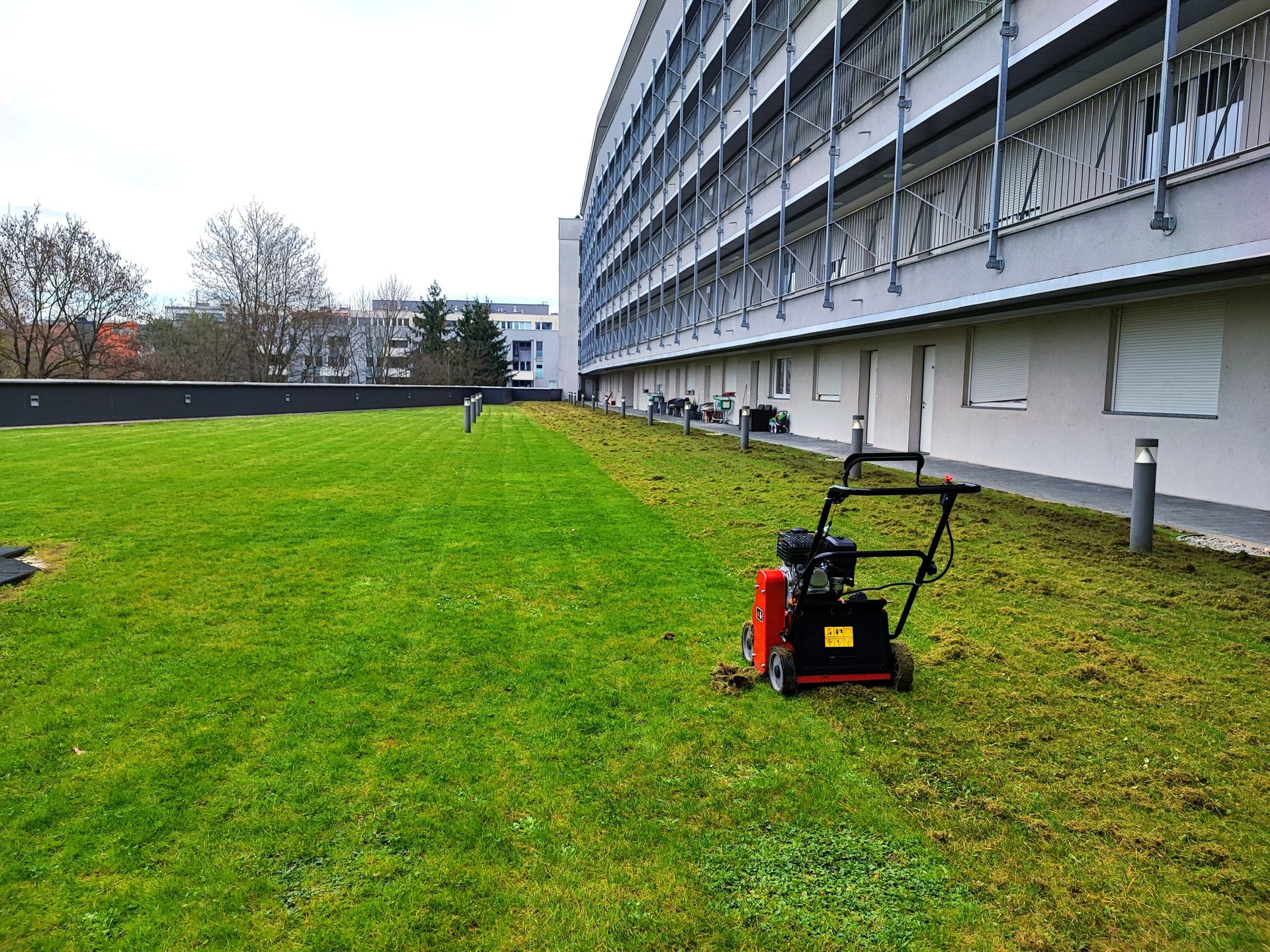 Spomladi leta 2023 smo stranki začeli urejati okolico. Ker je na zelenih površinah otežen dostop in veliko zasaditve se dela najprej opravijo s kosilnico na nitko, nato pa z potisno kosilnico na koš. Ob tem se prav tako očistijo vse tlakovane poti in odstrani ves plevel, ki raste ob robnikih. Po končani košnji pa celotno okolico spihamo s pihalnikom in prav tako odpeljemo zeleni rez na deponijo.